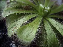 Unabhängig von ihrer Form zeichnen sich alle Sonnentauarten durch ihre mit klebrigen Sekreten besetzten Tentakel auf den Blättern aus, die bei allen Arten der Gattung bewegt werden können. Die Leimtentakel am Blattrand sind oft stark verlängert. Es handelt sich um gestielte Drüsen, die ein klebriges, zuckerhaltiges Sekret absondern, dessen Schimmern Insekten anzieht, die dann am Sekret kleben bleiben. Die Tentakeln in der unmittelbaren Umgebung um die Beute neigen sich daraufhin ebenfalls in Richtung des Fangs und verstärken so die Haftung und spätere Verdauung. Die gefangenen Tiere finden entweder durch Erschöpfung den Tod oder ersticken am zähen Sekret, das in ihre Tracheen einsickert und diese verstopft. Die Tentakel sondern derweil Enzyme wie Esterase, Peroxidase, Phosphatase und Protease ab,[5] die nun die Beute langsam zersetzen und die darin enthaltenen Nährstoffe lösen. Die so gelösten Nährstoffe werden dann von den auf der Blattoberfläche sitzenden Drüsen aufgenommen und für den Wachstumsprozess verwendet. Letztere können bei einigen Arten aber auch fehlen, so zum Beispiel bei Drosera erythrorhiza.