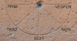 Auf dem Zifferblatt sind auch die Nachtgebete vermerkt, obwohl nur die Zeiten zwischen Sonnenaufgang (PRIMA) und Sonnenuntergang (VESPERAE) anzeigbar sind. Nur der Mittag (SEXTA) kann als der Zeitpunkt des Durchgangs der Sonnenmitte durch den Meridian genau angezeigt werden. Auf dem Bild wird bald eine Stunde am Nachmittag, die als Zeitpunkt für das NONA-Gebet bestimmt ist, angezeigt.