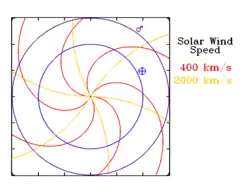 Der Sonnenwind strömt radial von der Sonne fort. Aufgrund der Sonnenrotation – eine Umdrehung in etwa 27 Tagen, bezogen auf die Erde – bildet er jedoch dabei spiralig gekrümmte Kurven, ähnlich dem Wasserstrahl eines Sprinklers.[20] Der schnelle Sonnenwind formt dabei steilere Spirallinien als der langsame Sonnenwind (siehe nebenstehende Abbildung). Hierdurch entstehen an den Kreuzungspunkten Druckwellen, bestehend aus einem vorwärts und einem rückwärts gerichteten Wellenpaar. Diese werden co-rotating interaction regions (CIRs) genannt. Mit den Voyager-Sonden wurde entdeckt, dass Gruppen dieser CIRs ihrerseits miteinander verschmelzen können, wodurch merged interaction regions (MIRs) entstehen. Diese Interaktionen geschehen typischerweise bis etwa 10 AE. Jenseits davon bestehen komplexe Strukturen, so dass der Sonnenwind auch in großer Entfernung kein homogener Fluss ist.[21]