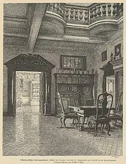 «Schweizerisches Landesmuseum: Lichthof mit Inventar aus dem 18. Jahrhundert und Ausblick in das Porzellanzimmer», Zeichnung von Sophie von Wyss (1901)