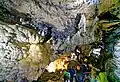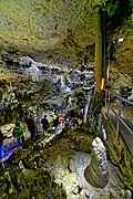 Der Weg führt durch einen etwa drei Meter langen, sehr engen Gang auf eine Plattform im oberen Teil der ersten Abteilung der Höhle. Direkt vor dem Weg, der dort nach links führt, befindet sich das „Elefantenohr“, eine freihängende Sinterfahne von mehr als einem Meter Länge. Als Gegenstück hat sich am Boden ein Stalagmit gebildet, der „Bienenkorb“. Der Weg führt dann an der „Orientalischen Stadt“ vorbei und biegt in einem Halbkreis nach rechts ab. Die „Orientalische Stadt“ befindet sich links in halber Höhe in einer kleinen Höhlung und besteht aus zahlreichen Kerzenstalagmiten. Anschließend führt eine Treppenanlage mehr als zehn Meter nach unten, wo sich ein aus Knochen zusammengestellter Höhlenbär der kleinen Höhlenbaerenrasse Ursus spelaeus eremus[20] befindet. Die Versinterungen an der rechten Wand erinnern an einen Wasserfall und gaben Anlass, der Formation ebendiesen Namen beizulegen. An der Decke befinden sich Sinterfahnen, vereinzelt auch Sinterröhrchen. Am Boden liegen mit Sintermasse überzogene ur- und frühgeschichtliche Knochen, besonders Rentiergeweihabwurfstangen und ein Mammutbecken die vom Cromagnon-Menschen des Gravettian wahrscheinlich im schamanischen Kontext in der Höhle an einer Stelle deponiert wurden. An mehreren Stellen haben sich auch Stalagmiten mit Tropftrichtern gebildet.