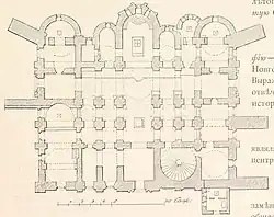 Die Sophienkathedrale ist eine fünfschiffige Kathedrale mit drei Apsiden und zehn Stützsäulen. An drei Seiten, mit Ausnahme der östlichen, befinden sich zweistöckige sehr breite Galerien.