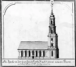 Der barocke Kirchturm wurde in den Jahren 1732–1734 durch den Turmbaumeister Johann Friedrich Grael angefügt. Seine Pläne waren zugleich eine Reminiszenz an den von Andreas Schlüter entworfenen Münzturm, der noch während seiner Bauzeit eingestürzt war.[3]