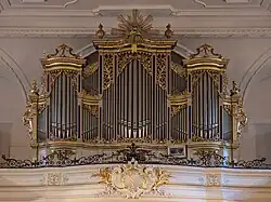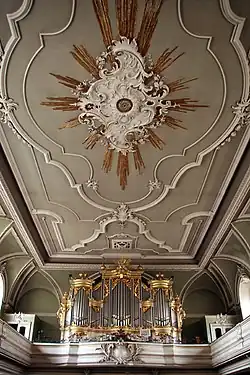 Die gerade rechteckige Decke des Hauptschiffs ist mit goldener Rokoko-Ornamentik prachtvoll ausgestaltet.[1] Vom Rand der Decke gehen Vouten in tragende Wandpfeiler auf der Empore über.