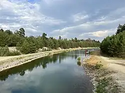 Am Kanal befindet sich ein Doppelschütz-Wehr. An dieser Stelle wird er durch einen Radwanderweg, einen ehemaligen Wirtschaftsweg der Lausitzer und Mitteldeutschen Bergbau-Verwaltungsgesellschaft (LMBV) überquert.