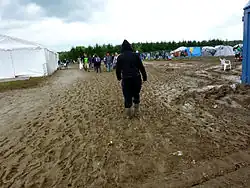 Dauerregen verwandelte das Camping- und Festivalgelände in eine knöcheltiefe Schlammwüste.[24] Ein in der Nacht vom 17. auf den 18. Juni auftretendes lokales Starkregenereignis (Niederschlagsmenge: 80 l/m²) erforderte ein Aufgebot von Arbeitskräften, Eisenplatten, über 500 m² Hackschnitzel und diverse Lkw-Auflieger Stroh sowie schweres technisches Gerät,[25] um die beiden Eingänge zum Festivalgelände passierbar zu machen.[26] Überdies setzte die Schafskälte mit Temperaturen unter der 10-Grad-Marke den Besuchern zu.[22] Aus diesem Grund öffnete die Gemeinde die Homburghalle, und viele Einwohner stellten Privatunterkünfte und Duschmöglichkeiten zur Verfügung.[27]
