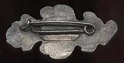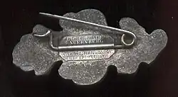 Rückseitig querliegende, starke Nadel, mit rechteckiger Sockelplatte aufgelötet. Es gibt Stücke ohne Herstellerbezeichnung; andere tragen auf der rückseitigen Sockelplatte der Nadel die Firmenaufschrift: