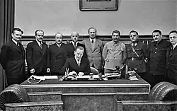Am 23. August 1939 unterzeichneten die Sowjetunion und NS-Deutschland den Molotow-Ribbentrop-Pakt und teilten Osteuropa in Einflusssphären auf. Gemäß den geheimen Zusatzprotokollen des Pakts wurden große Teile Polens der deutschen Einflusssphäre zugewiesen, während die baltischen Staaten im Kriegsfall den Sowjets zugeteilt wurden.[1] Als die Rote Armee nach dem Überfall der Wehrmacht auf Polen am 1. September 1939 am 17. September im Osten Polens einmarschierte, übernahmen sowjetische Truppen auch die Region Vilnius, die gemäß den sowjetisch-litauischen Verträgen von 1920 und 1926 Litauen zugestanden wurde. Am 28. September 1939 unterzeichneten Deutschland und die UdSSR den Grenz- und Freundschaftsvertrag, in dem festgelegt wurde, dass Deutschland als Entschädigung für die von Deutschland besetzten polnischen Gebiete Litauen mit Ausnahme eines kleinen Gebiets in Suvalkija an die sowjetische Einflusssphäre abtreten würde.[2] Der Gebietsaustausch war auch durch die sowjetische Kontrolle über Vilnius motiviert: Die Sowjetunion konnte Vilnius als Verhandlungsmasse nutzen und so erheblichen Einfluss auf die litauische Regierung ausüben, da diese Vilnius als ihre de jure Hauptstadt beanspruchte.[3]