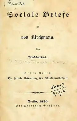 Ab 1842 begann der Jurist und Landwirt Karl Rodbertus seine sozialen und ökonomischen Studien zu veröffentlichen (Erkenntnis unserer Zustände 1842, Soziale Briefe 1850–1852[27]).[28] Sein Ansatz war es einerseits, die begrifflich-analytische und logische Stärke der klassischen Ökonomik für entwicklungsgeschichtliche Studien der griechischen und römischen Antike sowie der Moderne fruchtbar zu machen. Andererseits griff er die theoretischen Annahmen und Konzepte vor allem Adam Smiths an, indem er die empirische Dynamik und die historischen Besonderheiten gesellschaftlicher Prozesse betonte. Seine methodologische Kombination von Theorie und Geschichte nahm den späteren Wesenszug neu entwickelter Wissenschaftskonzeptionen vorweg, die ähnliche Syntheseversuche darstellten.[29]