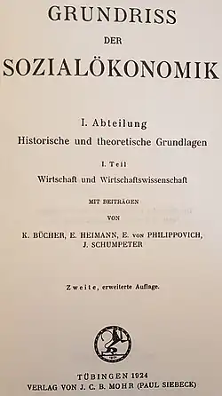 - ↑ Eduard Heimann: Entwicklungsgang der wirtschafts- und sozialpolitischen Systeme und Ideale. II. Die jüngste Entwicklung, in: Max Weber u. a. (Hrsg.): Grundriss der Sozialökonomik, 1. Abteilung: Historische und theoretische Grundlagen, I. Teil: Wirtschaft und Wirtschaftswissenschaft, 2. erw. Auflage, Tübingen 1924, S. 184ff. und Ders.: Soziale Theorie des Kapitalismus. Theorie der Sozialpolitik, Tübingen 1929. Vgl. Heinz Rieter: Eduard Heimann – Sozialökonom und religiöser Sozialist, in: Rainer Nicolaysen (Hrsg.): Das Hauptgebäude der Universität Hamburg als Gedächtnisort. Mit sieben Porträts in der NS-Zeit vertriebener Wissenschaftlerinnen und Wissenschaftler, Hamburg 2011, S. 229ff.