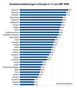 Die Europäische Kommission berechnet die Sozialausgaben nach eigenen Kriterien, weshalb sich zum Teil Abweichungen zu den einzelnen nationalen Berechnungen ergeben können. Im EU-Vergleich ergeben sich nach den Zahlen von 2014 vergleichsweise hohe Sozialleistungsquoten unter anderem in den Ländern Frankreich, Deutschland, Dänemark, den Niederlanden und Schweden, vergleichsweise niedrige Sozialleistungsquoten unter anderem in den Ländern Polen, Lettland, Bulgarien und Irland.[7] Die Sozialleistungsquote in verschiedenen Ländern zu vergleichen ist angesichts unterschiedlicher Sozial- und Gesellschaftssysteme nur eingeschränkt möglich. Unter anderem unterliegen die Sozialleistungen in verschiedenen Ländern unterschiedlicher Besteuerung. Während etwa das Arbeitslosengeld in Deutschland steuerfrei gezahlt wird, unterliegen die entsprechenden Leistungen in den skandinavischen Ländern oder den Niederlanden der normalen Besteuerung. Hierdurch ergeben sich deutliche Unterschiede in der Brutto- und der Nettosozialquote.[15] Wofür die verschiedenen Staaten ihre Leistungen aufwenden, unterscheidet sich je nach Land zum Teil erheblich, allerdings erfolgen die finanziell höchsten Leistungen in allen EU-Ländern insgesamt für die Alterssicherung und das Gesundheitswesen.[7]