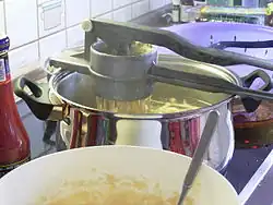 Eine Spätzlepresse (auch Spätzlespresse) ist ein Küchengerät, mit dem mit Hilfe von Druck aus Teig Spätzle gepresst werden.