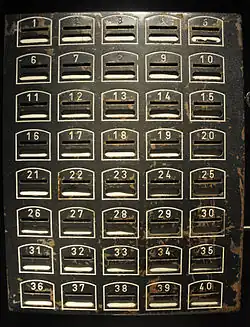 Im ersten Drittel des 20. Jahrhunderts kamen Sparschränke (auch: Gemeinschaftssparschrank, Sparkasten oder Sparkästchen, in Österreich auch Sparvereinskasten) auf, die eine Einzahlung von Spareinlagen auch ohne Anwesenheit eines Kassierers ermöglichten.[14] Derartige Modelle aus Stahl, oder seltener aus Holz, verfügen über eine Reihe nummerierter Fächer mit Schlitzen, in die Bargeld gesteckt werden konnte. Die Schränke wurden in vielen Gaststätten aufgehängt und fanden sich ebenso in Schulen und Läden, wo etwa das herausgegebene Wechselgeld zum Sparen verwendet wurde. Sie wurden von Banken und Sparkassen im Rahmen der Unterstützung des Gemeinschaftssparens, versehen mit einem Aufdruck des jeweiligen Instituts, kostenlos zur Verfügung gestellt. Der Schrank fungierte als Blickfang für den zukünftigen Sparer, als „stummer, aber unermüdlicher und kostenloser Werber“.[15]