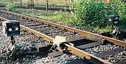 Ortsbediente Gleissperre in einem Schmalspurgleis 2021, die Ablaufschwelle fehlt