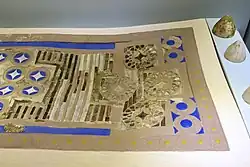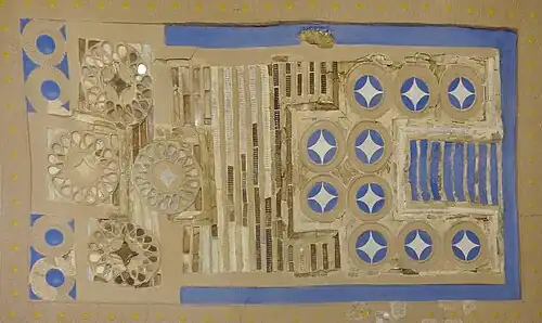 Das „Spielbrett“ aus Elfenbein bildete wahrscheinlich die Oberseite eines hölzernen Kastens. Es ist mit Einlagen aus Bergkristall und Lapislazuli-blauem Glas versehen sowie teilweise mit Gold- und Silberfolie überzogen. Als Rahmen dient die Darstellung von 72 Margeritenblüten. Auf der einen Seite sind vier große, kreisförmige Medaillons kreuzförmig angeordnet, deren Außenseiten je ein Paar gegenläufiger Spiralen ausfüllen. Die Medaillons besitzen einen äußeren Schlaufenring aus Elfenbein mit silberunterlegten Glas- und Bergkristalleinlagen und im Kern je eine Raute mit eingezogenen Seiten. Zur anderen Seite der Medaillons schließt sich eine H-förmige Zone aus abwechselnd flachen Bergkristall- und gerundeten Elfenbein-Streifen an. Die Gegenseite des „Spielbretts“ wird von zehn kleineren Rautenkreisen ausgefüllt, aufgeteilt in eine zentrale Vierergruppe und zwei seitlichen Dreierreihen. Der Raum zwischen den vier letzten Kreisen der Dreierreihen besteht aus Elfenbein- und Bergkristall-Streifen.[5]