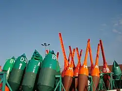 - ↑ in vielen Fällen werden die Gefahrenstellen nicht von vier Tonnen für alle vier Himmelsrichtungen, sondern lediglich durch eine einzige Spierentonne gekennzeichnet