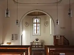 Die Kirche besteht aus einem schlichten, flachgedeckten Saal mit fünf Fensterachsen und einem geosteten, rund geschlossenen Chorraum. Das Innere der Kirche ist äußerst schlicht gehalten. Bis auf wenige Schrift- und Umrahmungsfresken ist sie ungeschmückt. Der Abendmahlstisch aus Holz steht im Chorraum, darüber hängt ein metallenes Kreuz. Die einfache Kanzel ist an der Südecke neben dem Chor im Langhaus an der Wand angebracht. Ihr gegenüber steht der Ambo, der ebenfalls äußerst schlicht gehalten ist. Im Westen der Kirche befindet sich eine Orgelempore.