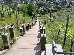 Der obere Teil der 397 Stufen, links das Tor in den Weinberg Goldener Wagen (nach der Sanierung 2012)