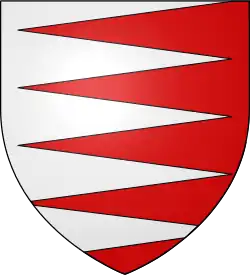 - Blasonierung des Stammwappens: „In Blau aus einer silbernen Wolke am linken Schildrand wachsend ein gebeugter, silberner Panzerarm, in der natürlich tingierten Hand ein goldbeheftetes, silbernes Schwert haltend. Auf dem silbern-blau bewulstetem Helm (auf gelehntem Tartschenschild) mit blau-silbernen Decken der wachsende Schwertarm.“