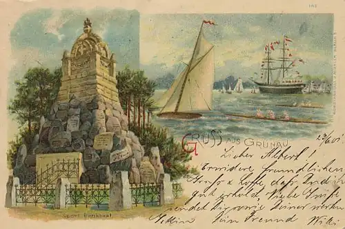 In Grünau hatten sich in den letzten Jahrzehnten des 19. Jahrhunderts zahlreiche Wassersportvereine niedergelassen. Das Berliner Adressbuch nennt im Jahr 1922 folgende Klubs: „Berliner Regattaverein“, „Berliner Seglerklub“, „Ruderriege des Akademischen Turnvereins“, „Akademischer Ruderverein zu Berlin“, „Berliner Ruderklub ‚Spreehort‘“, „Berliner Ruderclub ‚Sport Borussia‘“, „Rudergesellschaft ‚Viktoria‘“, Wassersportabteilung der Deutschen Landsmannschaft. Diese hatten ihre Grundstücke alle Am Langen See.[1] Von den Vereinen war die Idee ausgegangen, die Konzentration dieser Klubs durch ein gemeinsames Sportdenkmal zu würdigen. Der Bildhauer Bodo Ebhardt entwarf in ihrem Auftrag ein Denkmal, auf dem sich über einem pyramidenförmig geschichteten Postament ein Sandsteintempelchen bis in eine Höhe von zirka fünf Metern erheben sollte. Alle deutschen Sportvereine wurden aufgerufen, Natursteine aus ihrem Heimatort, versehen mit den Inschriften des Vereinsnamens und des Ortes zu spenden. Mehr als 300 Vereine folgten dem Aufruf. Die meisten Steine kamen von Rudersportvereinen aus Preußen. Neben Sportvereinen aus Berlin lieferten Vereine aus der damaligen näheren Umgebung (z. B. Charlottenburg, Grünau, Köpenick, Reinickendorf, Rixdorf, Spandau, Tegel) ihre signierten Steine. Auch aus ferneren Orten wie Metz und Memel fanden sich Steine ein. Geologische Untersuchungen der am Ende des 20. Jahrhunderts wieder aufgefundenen Teile des Denkmals geben Aufschluss über die genaue Herkunft der Steine.