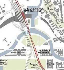 - eine einzelne dieser Windungen, diejenige zwischen dem Reichstagsgebäude im Osten und der Kongresshalle im Westen (wie in der nebenstehenden Bildunterschrift),
