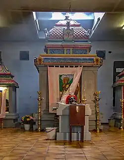Der Tempel wurde im Jahre 1994 in dem Gebäude und auf dem Gelände einer ehemaligen Gaststätte errichtet.[1][2] Die Hindustätte ist einer der ersten Tempel in Deutschland und flächenmäßig der größte im Südwesten. Die Gemeinde umfasst das Saarland, Luxemburg und angrenzende Ortschaften von Frankreich, Baden-Württemberg und Rheinland-Pfalz. Der Tempel ist Sri Maha Mariamman, der hauptindischen Muttergöttin, gewidmet. Die Gläubigen sehen in der Göttin ihre eigene Mutter. Sie sorgt für Wohlergehen, Gesundheit, ist Begleiterin in schweren Tagen. Sri Maha Mariamman sitzt in dem großen prachtvollen Schrein in der Mitte des Raumes. Sie hat prunkvolle Gewänder an und ist mit vielen Blumen geschmückt.[1] Zudem werden hier in Schreinen auch Gottheiten wie Ganesha, Murugan, Shiva, Vairavar und die Navagrahas verehrt.