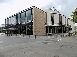 Die Sitzplatzzahl wurde auf etwa 800 reduziert, auf die rückwärtige Sängertribüne im Zuschauerraum wurde verzichtet. Dies erlaubte eine großzügige Gestaltung des Innenraumes, der insgesamt die Form eines geschlossenen Zylinders seines Vorgängerbaus wahrt. Um diesen Baukörper wurde ringförmig das Foyer angelegt, dessen Außenwand überwiegend Glasflächen bilden.[40] Dies geschah unter bestmöglicher Nutzung des überkommenen Grundstücks, das wegen der angrenzenden Straßen nicht vergrößert werden konnte.[41] Die Baukosten beliefen sich auf 10,8 Mio. Deutsche Mark.[42] Der Bühnenturm wies zum einen weit mehr Schäden auf, als zunächst angenommen, zum anderen musste er erhöht werden, um für die neue Bühne auszureichen. So wurde der Sanierungsaufwand sehr viel höher, als ursprünglich kalkuliert.[43] Im Übrigen wurde der überkommene Bühnentrakt in erheblichem Umfang wiederverwendet.[44]