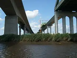Gebaut wurde die (zuletzt) dreispurige, ursprünglich mit zwei Fahrstreifen und beidseitigen Seitenstreifen angelegte Hochbrücke zwischen 1965 und 1967 mit 26 Öffnungen, einer Gesamtlänge von 1160 m und einer Breite von 16 m. Die Spannbetonkonstruktion besteht aus drei Abschnitten.
