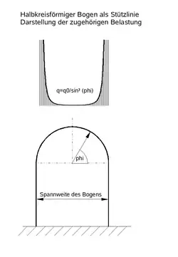 Bei vorgegebener Geometrie eines Gewölbes ist der ideale Lastverlauf für die Baustatik von Interesse. Im Falle eines halbkreisförmigen Bogens ist dies die Funktion: