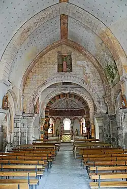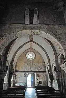 Das einschiffige Langhaus ist drei im Grundriss rechteckige Joche lang und wird von Spitzbogengewölben überdeckt, die von zwei kräftigen, spitzen Gurtbögen getrennt sind. Unmittelbar vor der Vierungswand gibt es noch einen vierten, etwas schmaleren Gurtbogen. Die Gurtbögen werden an ihren unteren Enden knapp 1,50 Meter senkrecht nach unten verlängert (gestelzt). Die Bogenenden werden von auf der Innenseite profilierten Kämpfern markiert. Nur unter dem Kämpfer in der Ecke zwischen Vierungswand und Südwand des Schiffs gibt es einen kapitellartigen Wulst. Die senkrechten Gurtstücke stehen auf gut zwei Meter langen, halbrunden Säulenschäften, die wuchtige pflanzlich skulptierte Kapitelle tragen, die mit kräftigen Kämpferplatten abgedeckt und deren untere Sichtkanten abgeschrägt sind. In den Ecken zwischen Vierungswand und den Seitenwänden des Schiffs steht, statt der Säule mit Kapitell, eine im Querschnitt fast quadratische Wandvorlage mit einer Kämpferplattenabdeckung. In den Ecken zwischen der Westwand und den Seitenwänden gibt es ebenfalls solche Wandvorlagen mit Kämpfern, jedoch ohne Untergurte.