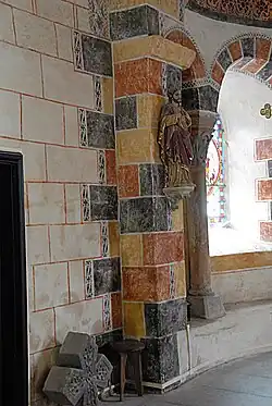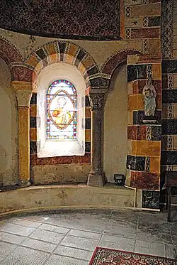 Der um die Apsisrundung aufgestellte Arkadenfries ist in kräftigen Farben dekoriert. Die Arkadenbögen sind in unterschiedlichen Farbkombinationen in rot-schwarz-gelb gefasst. Die Säulenschäfte sind mal schwarz, mal gelb oder in rot-weiß, oder im Wechsel in V-förmigen Steifen bemalt. Die seitlichen Kanten der Fensterleibungen sind mit im Wechsel rot-schwarzen „Ecksteinen“ bemalt.