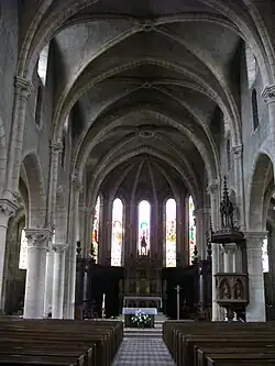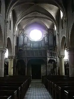 Rundpfeiler mit Knospenkapitellen tragen die Wände des Langhauses, spitzbogige Arkaden führen zu den Seitenschiffen. Die Säulen tragen den Wänden vorgelagerte dreigliederige Runddienste, die die Kreuzrippengewölbe tragen. Schmale Öffnungen in den Hochwänden unterhalb der Obergaden bilden ein rudimentäres Triforium. An der westlichen Stirnseite ruht eine mächtige hölzerne Orgelempore auf schmalen Rundsäulen.