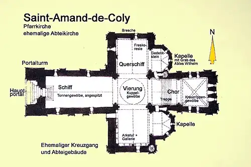 Der nördlichen Querhausarm war zusammen mit seiner Kapelle und der darin befindlichen Grabstätte des Abtes Wilhelm die Urzelle der Abteikirche. Sie hat vermutlich schon vor Fertigstellung der übrigen Bauteile für Gottesdienste zur Verfügung gestanden. Es gibt daher in der Rückwand des Querhausarms eine zusätzliche Außentür. Über sie fanden später auch die Gemeindemitglieder von Saint-Amand Zugang zu Gottesdiensten in kleinerem Kreis. Auf der nördlichen Wand der Kapelle ist eine 48 × 18 Zentimeter große Gedenktafel eingelassen, die sich farblich kaum vom umgebenden Mauerwerk unterscheidet und deshalb gerne übersehen wird. Ihre lateinische Inschrift in leoninischen Versen erinnert an das Wirken des hier bestatteten Abtes Wilhelm, des ersten Bauherrn der Abteikirche.