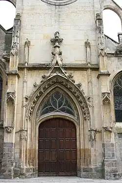 In das Tympanon des linken Seitenportals sind drei Figurennischen eingeschnitten, von denen nur noch die mit Blattwerk verzierten Sockel und die filigranen Baldachine erhalten sind. Die Archivolten sind mit durchbrochenen Maßwerkbögen besetzt, Weinranken schlingen sich um musizierende Engel und Fabelwesen.