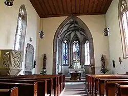 Der Chor wird von einem Netzgewölbe überwölbt. Ein spitzbogiger Triumphbogen bildet den Zugang zum Chor. Auf der Nordseite sitzt hoch oben eine Patronatsloge auf einer vielfach profilierten Konsole. Eine Steinbrüstung mit Maßwerk schützt die Besucher. Auf der westlichen Stirnseite sitzt eine hölzerne Orgelempore auf zwei schmalen Rundsäulen.