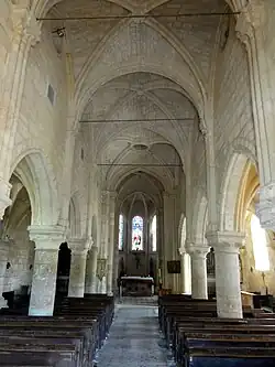 Die Kirche wurde im Stil der Gotik Anfang des 13. Jahrhunderts errichtet. Lediglich der südliche Teil wurde im 16. Jahrhundert erneuert. Die Kirche besitzt ein vierjochiges Langhaus, zwei Seitenschiffe und ein Querhaus, an das sich ein kleiner Chor mit einem geraden Schluss anschließt. Der Turm über der Vierung besitzt langgezogene, spitzbogene Klangarkaden, er wird von einem Satteldach gedeckt. Die Fassade wird von Strebepfeilern gegliedert. Das Portal, ebenfalls von Strebepfeilern gerahmt, besitzt Archivolten auf Säulen ruhend, in dessen Tympanon sich ein Okulus befindet. Haupt- und Seitenschiffe werden von einem gemeinsamen Satteldach gedeckt.