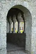 Im Westen ist an die Kirche eine Vorhalle angebaut, die sich über die gesamte Breite des Langhauses erstreckt. Sie ist von elf Arkaden durchbrochen und wird von einem Pultdach gedeckt. In der Mitte, gegenüber dem Portal der Kirche, sowie an den beiden Schmalseiten im Norden und im Süden führt je ein rundbogiger, schmuckloser Durchgang in die Vorhalle. Links vom zentralen Eingang sind sechs Arkaden angeordnet, die auf fünf Säulen aufliegen. Auf der rechten Seite tragen vier Säulen fünf Arkaden. Die Keilsteine der Bögen sind sorgfältig behauen. Die monolithischen Säulen besitzen Basen mit Rundstäben und Eckblättern. Die Kapitelle sind mit stilisiertem Blattwerk verziert. Die Spitzen der Blätter sind teilweise zu Kugeln gerollt, auf manchen sind menschliche Köpfe dargestellt.