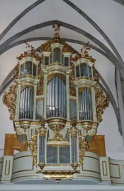 Orgel und Orgelprospekt wurden 1701 von dem Straßburger Orgelbauer Friedrich Ring (1666–1701) für die Neukirche in Straßburg erbaut und nach dem Tod von Ring 1702 von Claude Legros vollendet. 1708 baute Andreas Silbermann ein neues Pedalwerk. 1749 wurde die Orgel durch Johann Georg Rohrer an ihren jetzigen Standort transferiert. Während des Ersten Weltkrieges wurden 1917 infolge einer Beschlagnahme für Kriegsbedarf die zinnernen Prospektpfeifen konfisziert. 1933 führte Adolphe Blanarsch Reparaturen an der Orgel durch, 1955 die Firma Orgelbau Roethinger aus Straßburg und nach einem Brand im Jahr 1975 die Firma Alfred Kern & fils, die dann 1984 eine Rekonstruktion der Orgel von Rink und Legros im Zustand von 1748 durchführte.[2] Die Orgel besitzt die folgende Disposition:[3]