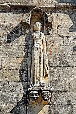 Im Brüstungsfeld dieses Blindfensters gibt es eine Monumentalskulptur, die einst im linken Fassadenfeld eine Entsprechung hatte. Es handelt sich offensichtlich um eine höher gestellte weibliche Persönlichkeit, in einem bis auf die Füße reichenden eher herrschaftlichen Gewand, mit Schmuckbändern, die von den Schulten bis zu Saum reichen. Der rechte Arm fehlt. Der Kopf wurde im Rahmen einer Restaurierung ersetzt. Der linke Arm hängt locker herab, und der Ärmel ist ab dem Handgelenk verlängert, mit einem über die Knie hinunterreichenden glockig geschwungenen unten offenen Gebilde. Die verbliebene Kontur des rechten Arms zeigt, dass auch dieser Arm herunter hing und der Ärmel die gleiche Verlängerung aufwies, wie beim linken. Ein solches Kleidungsdetail trägt auch eine weibliche Monumentalskulptur auf der Fassade von Saint-Martin de Chadenac. Die dortige Person wird als Prinzessin gedeutet, die vom hl. Georg aus der Gewalt des Drachen befreit worden ist.