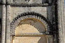 Der erste und innerste Archivoltenbogen hat eine gerundetes Kantenprofil und eine glatte Innenfläche. Seine Stirnseite trägt ein breites Band von Rosetten aus je vier zusammengerollten Eichenblättern. Dessen Außenseite wird von einem schmalen Band mit geometrischem Muster begleitet.