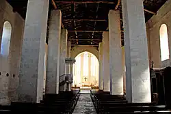 Der romanische Ursprungsbau des 12. Jhs. bestand aus einem sechs Joche langen Mittelschiff mit Tonnen-Einwölbung und zwei Seitenschiffen mit etwas tieferen Tonnengewölben, alles unter einem gemeinsamen Satteldach. Über einen wahrscheinlich vorhandenen Choranbau sind keine Belege bekannt.