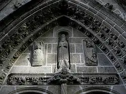 Das äußere Portal der südlichen Vorhalle wird von einem Kielbogen mit einer Kreuzblume bekrönt. Über den Archivolten, die unten mit Krabben und oben mit Figuren verziert sind, die unter kleinen Baldachinen stehen und Schriftbänder halten, thront Gottvater, der in der linken Hand die Weltkugel hält und die rechte Hand zum Segen erhoben hat. Zu seinen Füßen kauern zwei Engel, seitlich halten zwei Engel Schriftbänder in den Händen. Unter dem Giebel sind seitlich eine Sonnenuhr mit der Jahreszahl 1581 und in der Mitte zwei Reliefs angebracht, oben das Wappen der Bretagne mit den Hermelinschwänzen und zwei Hermelinen, über dem die Devise „a ma vie“ eingemeißelt ist. Der Raum über dieser Vorhalle wurde früher als Archiv genutzt.