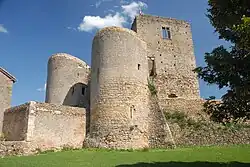 Das Felsplateau, auf dem Ort und Kirche liegen, war spätestens seit dem 9. Jahrhundert mauerbewehrt und soll bereits im 10. Jahrhundert von einem Donjon überragt gewesen sein. Der heute stehende Wohnturm ist aber ein Bauwerk des 13. Jahrhunderts, mit einer sog. Chemise, einer turmbewehrten Schildmauer, die die am meisten gefährdete Stelle des Turms schützte.