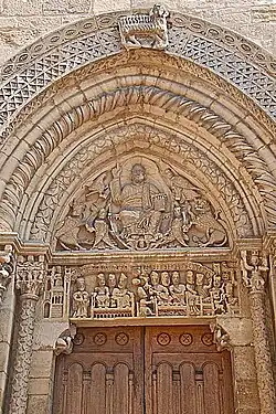 Das Hauptportal in der Fassade besitzt figürlichen Schmuck an Sturz und Tympanon; die Säulen und Archivolten sind von kleinteiligen geometrischen Mustern gleichsam eingesponnen. In dreifach gestufte Gewände sind schlanke Säulen eingestellt. Die äußeren sind spiralförmig gedreht, die inneren dicht mit einem Teppich von Blumenrosetten bestückt. Sie sind mit skulptierten Kapitellen, profilierten Basen und mehrfach gestuften Plinthen ausgestattet. Die äußeren Kapitelle sind Blattkapitelle, das linke innere ist mit feingliedrigem Pflanzenwerk skulptiert. Das rechte innere zeigt eine ziegenbärtige hockende Person, unter deren kurzem Rock ein gewaltiges männliches Geschlechtsorgan hervorlugt. Auf den Säulen stehen spitzbogige Archivoltenbögen aus Rundprofilen. Der innere Bogen ist wie die zugehörigen Säulen mit Blumenrosetten bedeckt, der äußere ist spiralförmig gedreht. Die Archivoltenbögen werden außenseitig von schlichten schlankeren Rundprofilen und tiefer liegenden flachen Keilsteinen begleitet, der innere Archivoltenbogen innenseitig von einem Rundprofil. Mehrfach profilierte Kämpferplatten markieren die Höhe der Bogenansätze. Ihre Profile werden als Trennung zwischen Architrav und Tympanon eingesetzt und auswärts um die Pilaster herumgeführt. Den äußeren Portalrahmen bilden rechteckige Pilaster. Das Dekorationsmotiv der Oberflächen ist ein doppeltes Band eines Flechtwerks aus diagonal über Kreuz geführten Bändern. Die Skulptur der Kapitelle ist rein pflanzlich. Über den Kämpfern steigt ein Spitzbogen auf in Breite und Gestaltung der Pilaster. Dieser Bogen wird noch einmal überfangen von einem Profil, in dem zwei Bänder sich überschneiden und eine fortlaufende Reihe von spitz-ovalen Mandelformen bilden. Die Zwischenräume sind mit Pinienzapfen gefüllt. An den Bogenenden stehen kleine Pinienzapfen, im Scheitel erscheint ein Relief des Lammes Gottes.