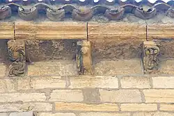 Die Portalöffnung, in die eine zweiflügelige Holztür eingehängt ist, wird oberseitig vom Türsturz abgeschlossen. Er liegt beidseitig auf den Kragsteinen der Türlaibung auf, die mit Skulpturen von hockenden menschlichen Personen versehen sind, eines Mannes und einer Frau.