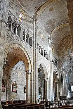 Das zweite Geschoss ist das Triforium und besteht aus einer Reihung von Drillingsarkaturen, zwischen dem Erdgeschoss und der Obergadenzone. Hinter den Arkaden befindet sich ein schmaler Laufgang, der von einer geschlossenen Wand zum Dachraum der hier anschließenden Pultdächer abgegrenzt wird. In jedem Joch sind zwei rundbogige Drillingsarkaden untergebracht. Ihre Bögen sind mehrfach profiliert und stehen jeweils gemeinsam auf Säulchen, mit skulptierten Kapitellen, profilierten Kämpfern und Basen. Die äußeren Bogenenden stehen auf im Querschnitt rechteckigen Pfeilern beziehungsweise Wandvorlagen, deren Sichtseiten mit Halbsäulen verkleidet sind. Auch ihre Bogenansätze werden von Kämpfern markiert. Die Kapitelle und Bogenwölbungen reichen hinter den Säulen bis zur Wand des Laufgangs. Unmittelbar über den äußeren Scheiteln Keilsteinbögen wird das Geschoss mit einem doppelten Rundprofil abgeschlossen.