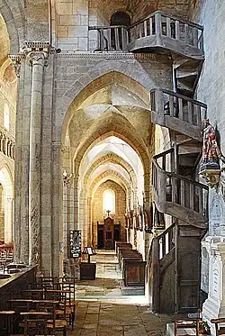 In Fortsetzung der Pilaster des Erdgeschosses sind im zweiten und dritten Geschoss den Pfeilervorlagen zwei nebeneinander stehende halbrunde junge Dienste vorgeblendet, die von gemeinsamen skulptierten Kapitellen gekrönt werden. Auf ihnen stehen im Querschnitt rechtwinklige und scharfkantige Gurtbögen, die das Tonnengewölbe in vier Abschnitte unterteilen.