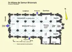 St-Hilaire ist eine dreischiffige Basilika, mit einem vierjochigen Langhaus in dem typischen dreigeschossigen Cluny-Aufriss, danach folgen ein kaum ausladendes Querhaus und ein dreischiffiges Chorjoch mit drei Apsiden.