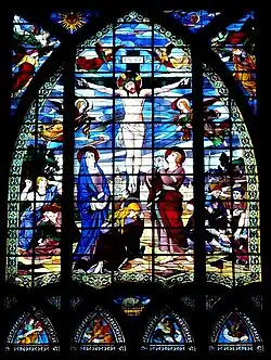 Das zentrale Fenster der Apsis wurde 1906 von Léon Tournel geschaffen und stellt die Kreuzigung Christi dar. Zu beiden Seiten des Kreuzes stehen Maria und der Apostel Johannes, der Lieblingsjünger Jesu. Am Fuß des Kreuzes kniet Maria Magdalena. Auf der rechten Seite würfeln Soldaten um die Kleider Jesu. Auf den unteren Fenstern wird – umgeben von den vier Wesen der Apokalypse – das Lamm Gottes auf dem Buch mit sieben Siegeln dargestellt.