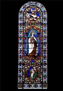 Die zahlreichen Glasfenster stammen von Félix Gaudin. Sie zeigen folgende Motive (umlaufend von hinten links bis hinten rechts): 1. Johannes der Täufer. 2. Katharina von Siena. 3. Erzengel Michael (unten), Margareta Maria Alacoque (oben). 4. Marienerscheinung von Lourdes (unten), Germaine Cousin, 1579–1601. (oben) 5. Johanna von Orléans (unten), heiliger Josef (oben). 6. Evangelist Johannes (unten), Genoveva von Paris (oben). 7. Matthäus (unten), Bernadette Soubirous (oben). 8. Therese von Lisieux (unten), Adam und Eva (oben). 9. Leben und Sterben Mariens. 10. Heiliger Josef (3 Szenen, unten), Passion Christi (oben). 11. Das Heil. 12. Herz Jesu (unten), Passion Christi (oben). 13. Sünde und Vergebung (3 mal 4 Medaillons). 14. Jungfrau Maria (unten), Passion Christi (oben). 15. Unbefleckte Jungfrau Maria (3 mal 4 Medaillons). 16. Allerheiligstes (5 Medaillons, unten), Pfarrer von Ars (oben). 17. Lukas. 18. Anna und Maria (unten), Johannes der Täufer (oben). 19. Heiliger Ludwig (unten), Heilige Familie in der Werkstatt (oben). 20. Jeanne de Chantal (unten), Franz Xaver (oben). 21. Franz von Sales (unten), Vinzenz von Paul (oben). 22. Jesus mit seinem Lieblingsjünger. 23. Antonius von Padua (oben).